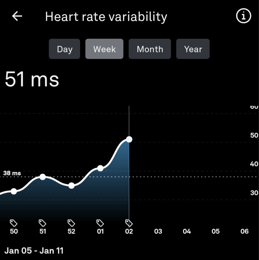 here are my HRV stats for the start of the year. I just started being a little more mindful about some habits, without setting a clear goal.